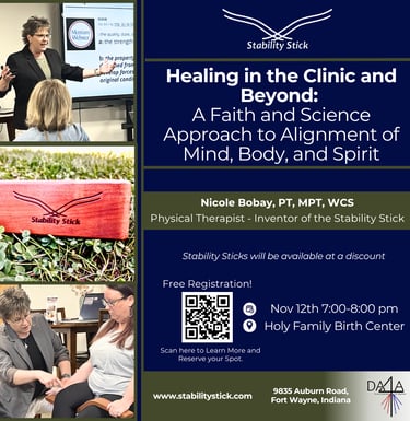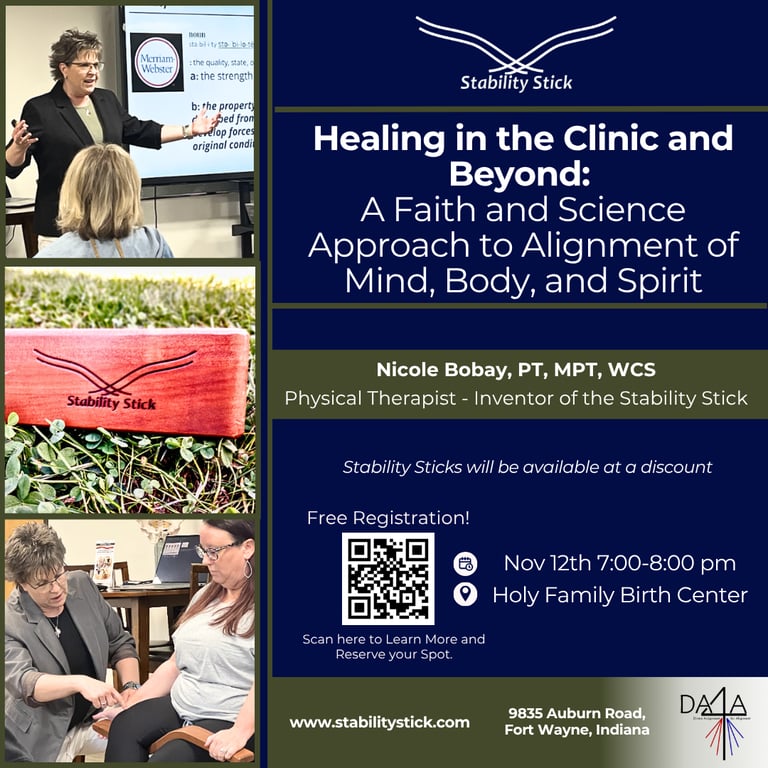 Join Nicole Bobay, PT, MPT, WCS, physical therapist and inventor of the Stability Stick, for a free, hands-on seminar exploring how physical alignment connects to something much deeper — the harmony of mind, body, and spirit.